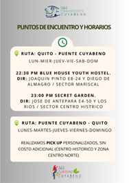 2. En autobús público:Hay servicios nocturnos de la linea Putumayo desde el terminal Sur de Quito, Quitumbe donde se llega en el Metro. Los servicios salen alrededor de las 11 de la noche y llegan en la madrugada en la entrada de Cuyabeno. Durante el día, hay servicios a Cuyabeno cada hora desde Quitumbe.