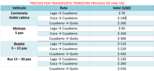 Los transfer Coca Cuyabeno demoran unas 3,5 horas; tienen un costo mínimo de $ 140 hasta 4 personas.